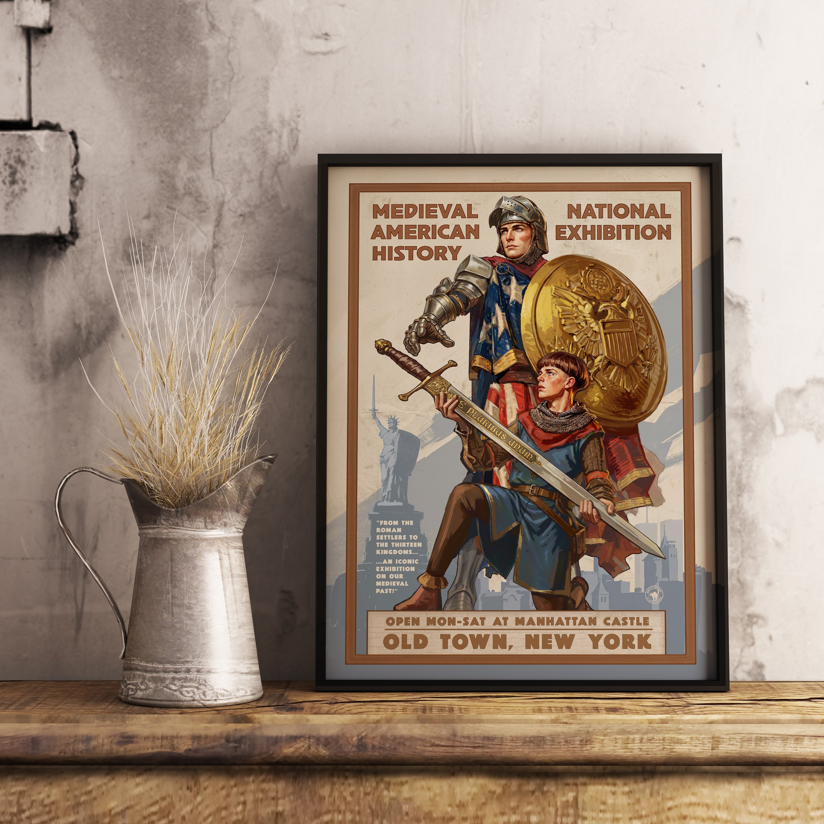 Originally developed in 1959 by renowned illustrator L.C. Meyenbecker and commissioned by the Royal Galleries of New York, the American Medieval Exhibition poster series has become synonymous with the era it depicts. Meyenbecker’s defining image - a knight of the Thirteen Kingdoms draped in the American banner, his squire presenting the sword to his outstretched hand - endures as one of the most powerful visual icons of medieval America.