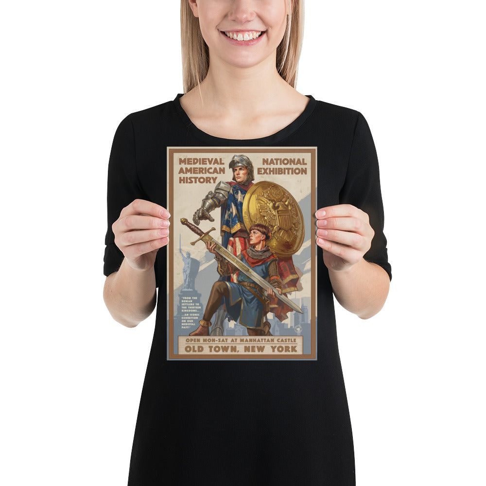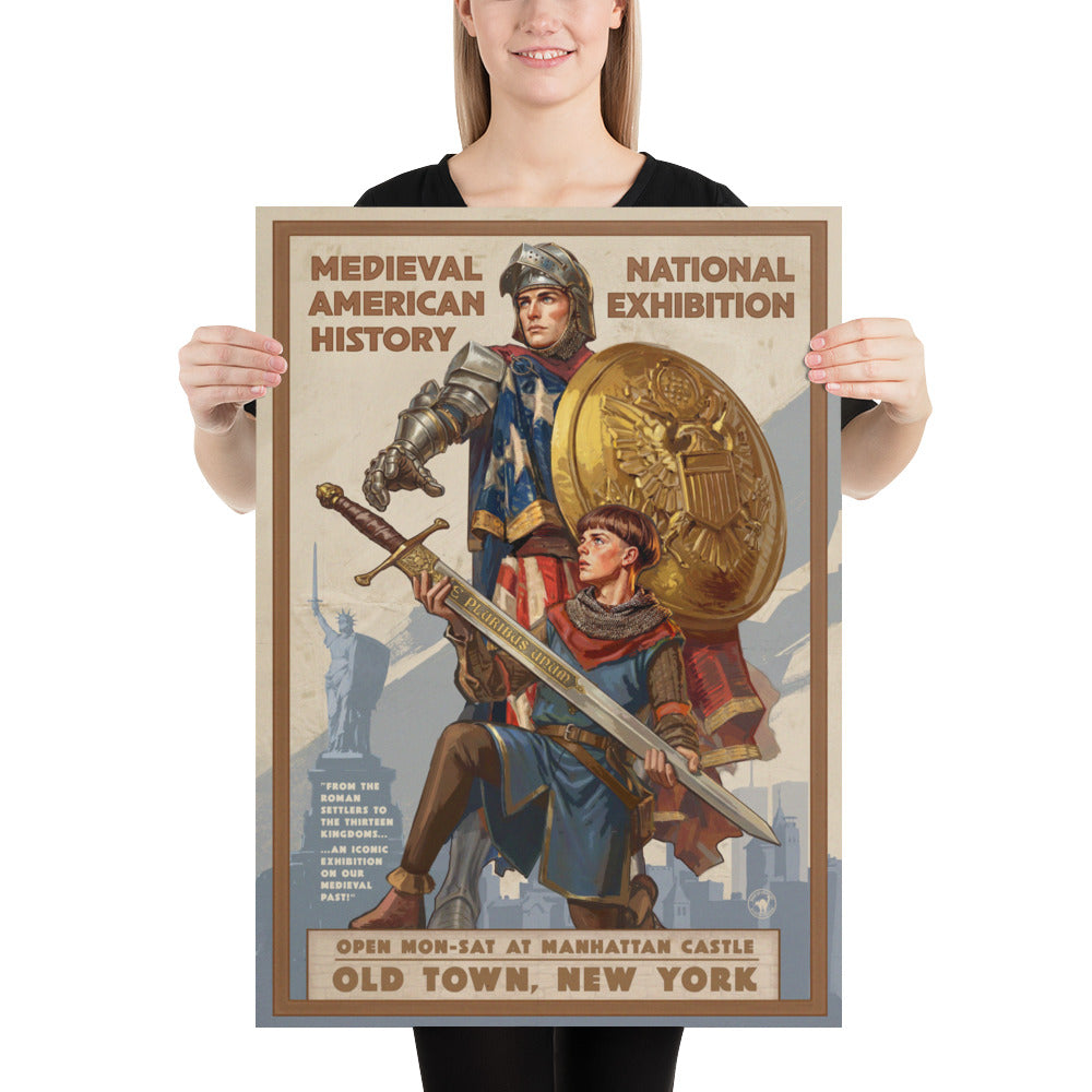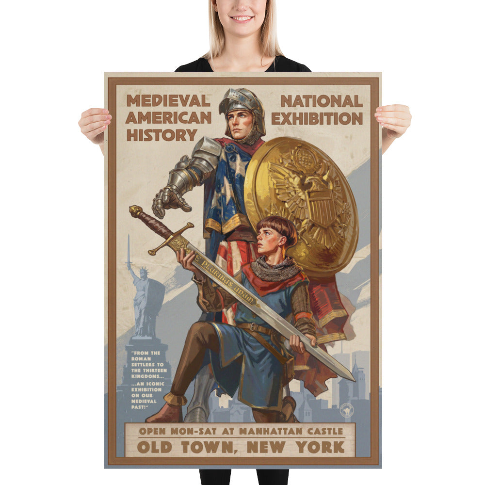 Originally developed in 1959 by renowned illustrator L.C. Meyenbecker and commissioned by the Royal Galleries of New York, the American Medieval Exhibition poster series has become synonymous with the era it depicts. Meyenbecker’s defining image - a knight of the Thirteen Kingdoms draped in the American banner, his squire presenting the sword to his outstretched hand - endures as one of the most powerful visual icons of medieval America.